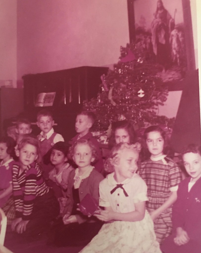 I realize now that Emmaus was some kind of safe haven for children who might not fit in anywhere else. When I was in first and second grade, the recognized leader of the ninth grade (who might have been labeled “Head Boy” at a fancier school) had a hook for at least one of his hands; I recall him holding the door with that hook for us little kids to go out to recess. In my class there was Tommy, who had no legs. He had a gorgeous voice so always got to solo with “O Holy Night” at the Christmas pageant. He also was the champion of our baseball team. Someone else had to run bases for him, but with his powerful arms he always smashed the ball out of the field.